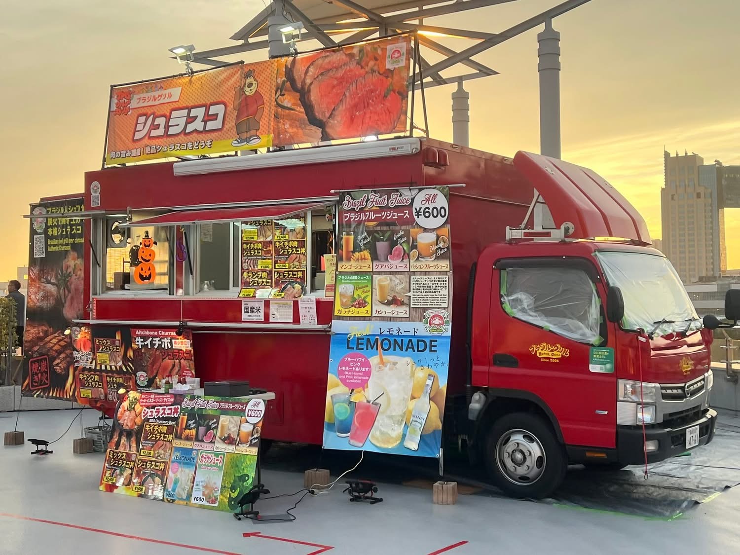 | 取扱いメニュー | 炭火焼き串(牛肉・鶏肉・ソーセージ)/ローストチキンレッグ(鶏もも焼き)/シュラスコ(ブラジル風バーベキュー)/シュラスコ丼/アルコール飲料(ビール・カクテルなど)/トロピカルフルーツジュース |