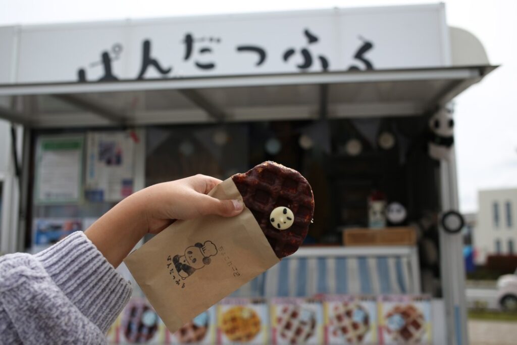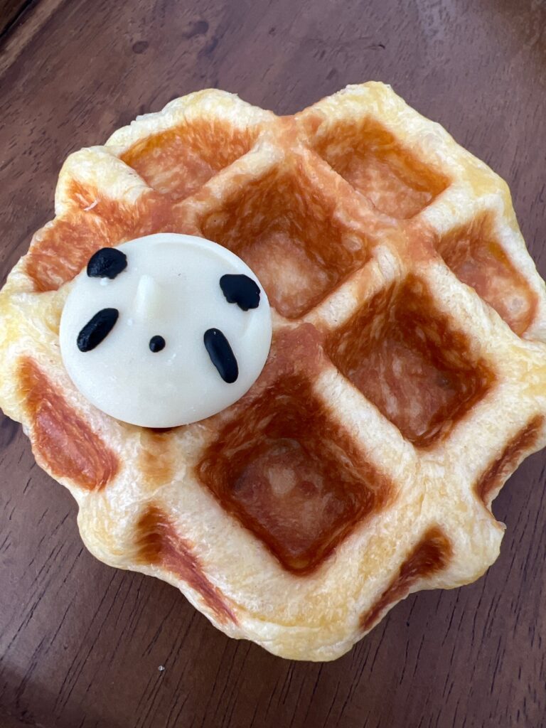 国産小麦を100%使用した サクサクしっとりのワッフルを提供しています。 ワッフルは1つずつ丁寧にこねてから焼いており、 パンダのチョコも1つずつ手書きで作ってます。